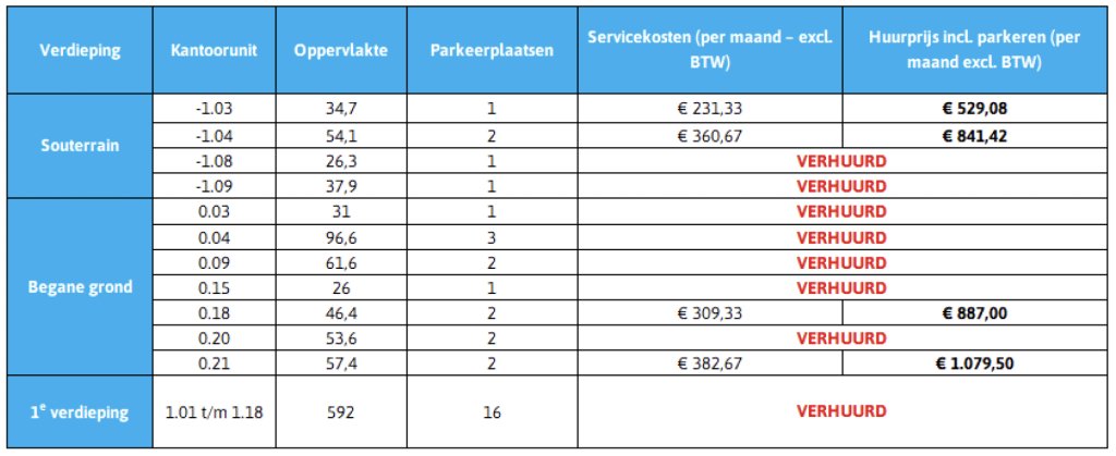 Verdieping Kantoorunit Oppervlakte Parkeerplaatsen Servicekosten (per maand – excl. BTW) Huurprijs (per maand – excl. BTW)